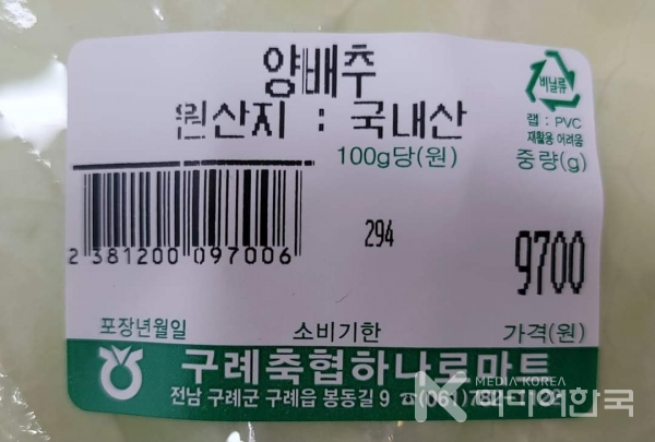 게재한 사진은 어제 6일 촬영한 것으로 구례읍 축협 하나로 마트에서 판매하고 있는 양배추 한 통의 가격표다. 며칠 전 양배추 한 통을 사려다 11,000원이라는 가격표를 보고 미쳤다며 한숨만 짓고 말았었는데, 어제 가서 보니 9,700원으로 쪼끔 내리긴 하였지만, 여전히 미쳤다는 생각에 그냥 보고만 돌아왔다.