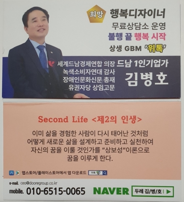 [미디어한국] 김병호 의장은 행복 디자이너. 세계드남경제연합 의장. 녹새소비자연대 감사. 장애인문화신문 총재. 유권자당 상임고문으로 활동 중이다.