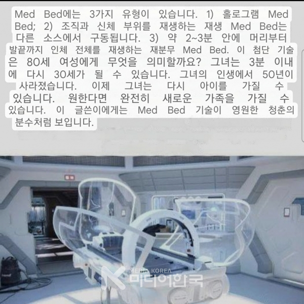 [미디어한국] 트럼프 미국 대통령에 의해 전 인류의 무상 의료복지가 실시된다. 위의 사진은 직역이지만 메드베드에 대한 설명이다.