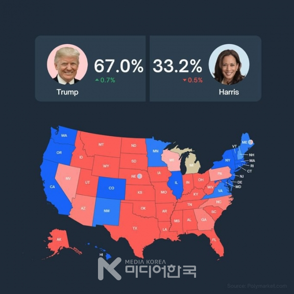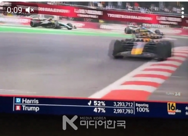"미국 ABC 방송국에서 실수로 카말라 해리스가 주요 경합 주에서 여유롭게 승리하는 대선 결과를 방송했다.