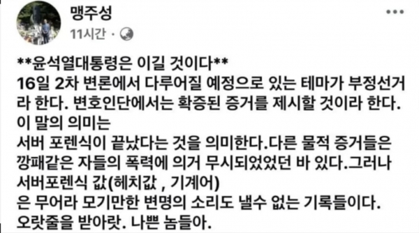 지난 12.3 대통령의 비상계엄에서 중앙선관위 서버의 수색에서 포렌식이 끝나서 윤 대통령의 변호인단에 확증된 증거를 제시할 것으로 판단된다.
