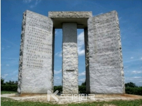 오늘 새벽에 조지아 가이드스톤이라 불리는 인구 5억 명 유지 등의 0스테이트 십계명이 적힌 돌의 영문판이 파괴되었다. 현재 지구인은 79억명에 이르고 있다.