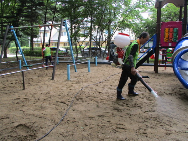 구는 매년 4월부터 11월까지 전담인력 3명을 투입, 모래놀이터가 있는 지역 어린이공원 30곳을 대상으로 소독을 하고 있다.