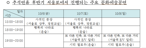 이외에도 10월9일(월) 10시, 16시에는 ‘해설이 있는 서울로 산책’이 진행되고, 매일 저녁마다 정준호, 김세형, 서울로프로젝트, 웰스엠, 영빈노래마을 등 버스커들의 버스킹 공연이 자유롭게 펼쳐진다.