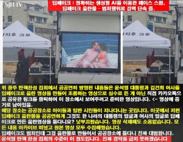 딥페이크로 인공지능 AI를 이용한 윤석열 내외의 "페이스 스왑" 의 딥페이크 음란물을 상영했다.