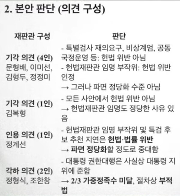 한편 기각 의견을 낸 헌법 재판관은 문형배, 이미선, 김형두, 정정미, 기복형 헌법재판관 등 5명이고, 정형식, 조한창 헌법재판관 등 2명은 각하 의견을, 정계선 헌법재판관 1명만 한덕수 국무총리 탄핵 인용 의견을 제시했다.
