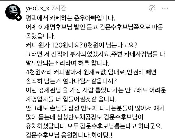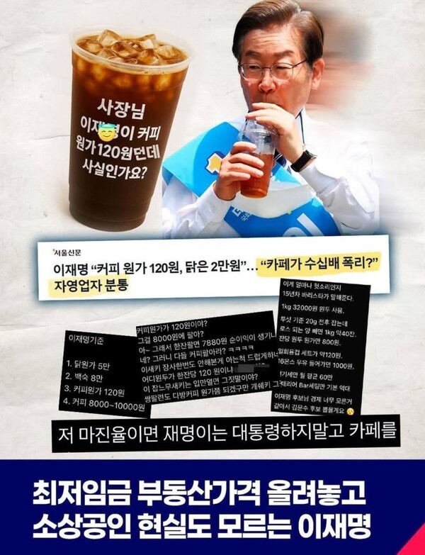 [미디어한국] 이재명 후보 경제 대통령 자처하더니 커피값 원가 120원 발언에 전국 커피 소상공인들이 분노로.