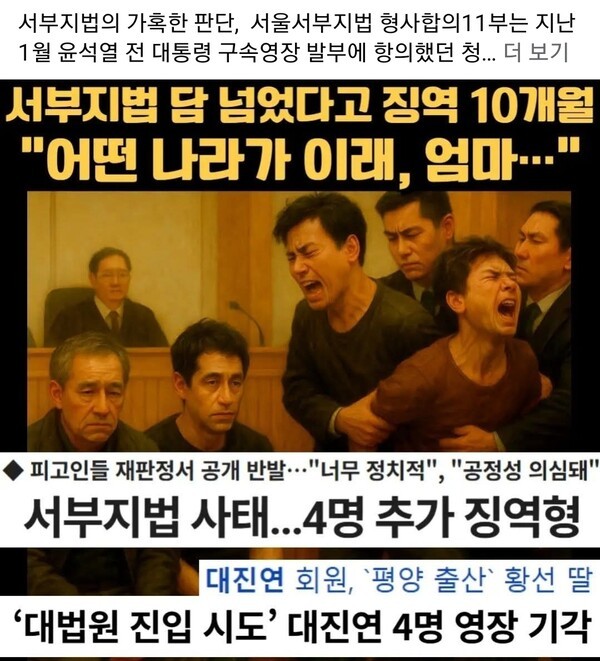 서부지법의 징역형은가혹한 판결으로 보여진다. 서울서부지법 형사합의 11부는 지난 1월 윤석열 전 대통령 구속영장 발부에 항의했던 청년 4명에게 선고를 했다.