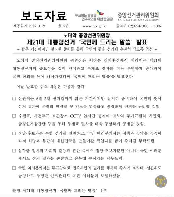 [미디어한국] 제21대 대통령 선거 D-14일이다. 부정선거 없는 대선을 위해 중앙선관관위 노태악 중앙선관위가 노력하고 있다.(보도자료 참고)