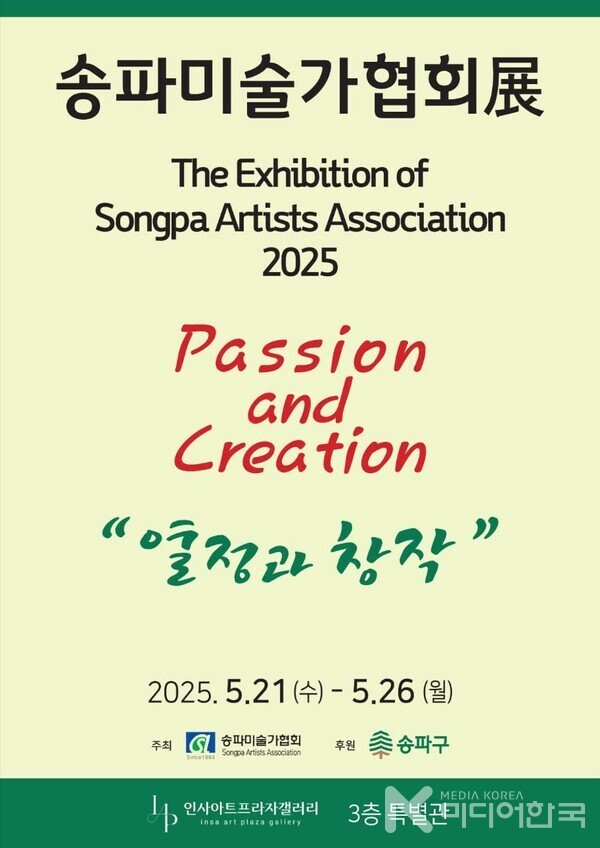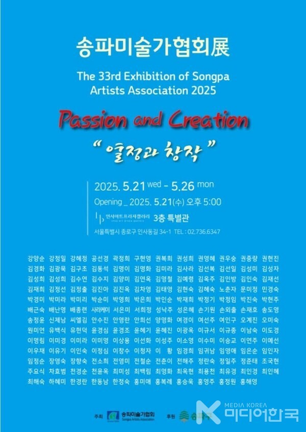 [미디어한국 조승희 기자] 송파미술가협회(회장 박미리)는 인사동 인사아트프라자갤러리(회장 박복신)3층 특별관에서 ‘열정과 창작(Passion and Creation)’을 주제로 제33회 정기전시회를 5월21일 부터 26일까지 개최한다.