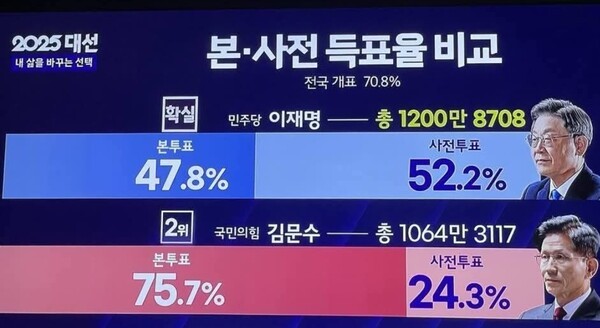 사전투표 34% 본투표 44% 본투표 이긴 후보가 사전투표 이기고 당선되는 것이 "대수의 법칙" 입니다. 즉 진리입니다.