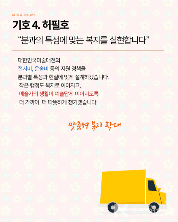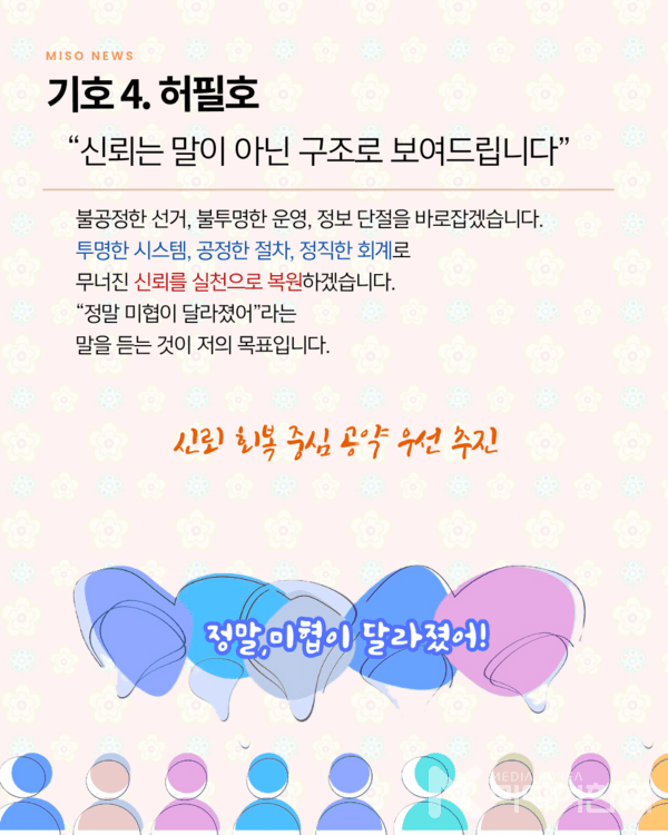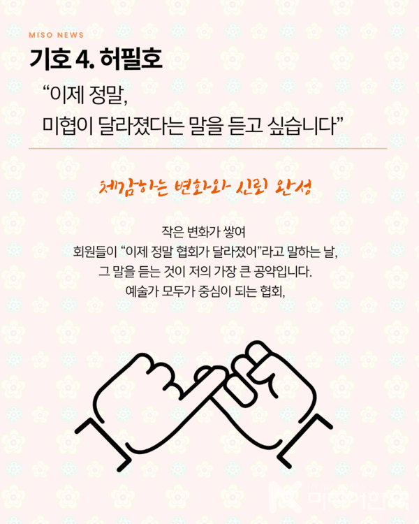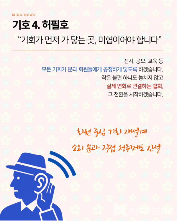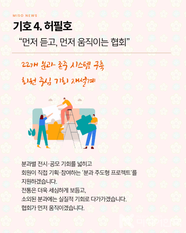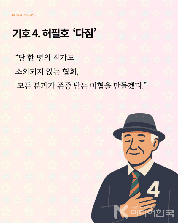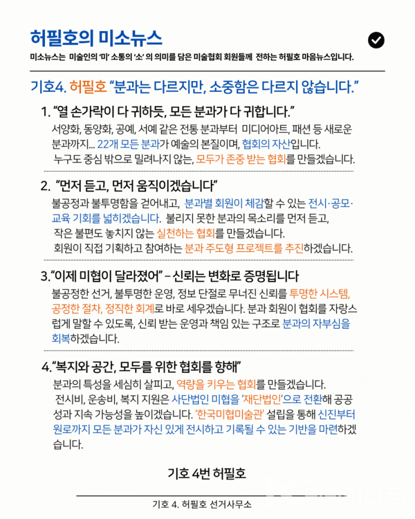 한국미협의 신뢰를 회복하고, 회원 모두가 주인 되는 협회를 만들겠다는 허필호 후보의 다짐은 협회의 미래를 향한 강한 의지를 담고 있다. ‘정직한 리더, 신뢰하는 미협, 존경받는 미술인’을 위한 약속을 가슴에 새기며, 이번 선거를 통해 한국미협이 다시 한 번 예술인의 자부심을 되찾는 전환점이 되기를 기대해 본다.