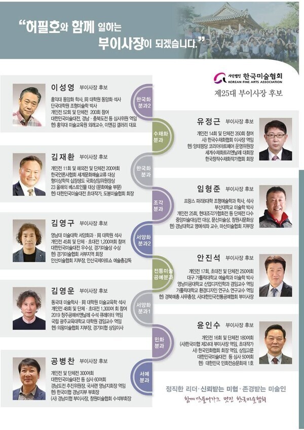 기호 4번 허필호 후보 부이사장 - 이성영(한국화2) 김재환(한국화) 김영구(서양화2) 김영운(서양화1) 공병찬(서예) 유정근(수채화) 임형준(조각) 안진석(전통미술공예) 윤인수(민화)