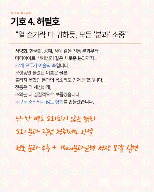 허필호 후보는 “단 한 명의 작가도 소외되지 않는 협회, 모든 분과가 존중받는 미협을 만들겠다”는 다짐과 함께, 동양화, 서양화, 조각, 공예, 수채화, 판화, 디자인, 서예, 문인화, 민화, 캘리그래피, 애니메이션, 평론 학술, 설치미디어, 전시기획 미술행정, 미술치료, 색채심리, 패션, 그리고 서예1(한글)분과, 서예2(한문)분과까지 총 22개 분과가 예술의 다양성과 깊이를 이루고 있지만 기회에서 멀어졌던 한분 한분에게 협회가 먼저 다가서고 AI·디지털 기반 예술과 융합교육도 품을 수 있는 열린 협회, 회원에게 따뜻한 친정 같은 협회를 만들겠다는 뜻을 전했다.