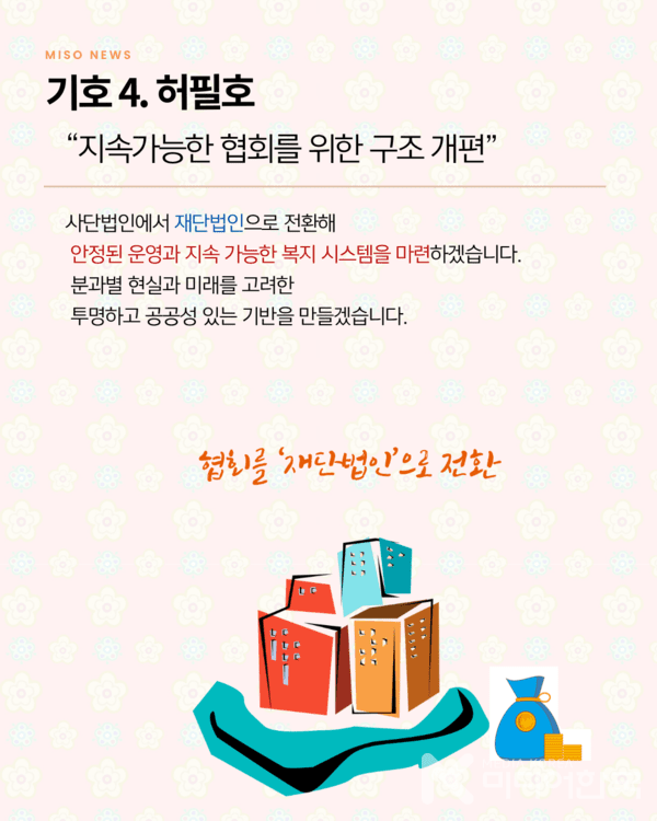 가장 시급한 문제로 ‘제도적 불신과 신뢰 붕괴’를 꼽았다. 정관위반, 폐쇄적 운영, 선거절차상의 불공정성등 투명성과 정당성이 훼손되었기에, 허필호 후보는 이를 해결하기 위해 ‘공익감시단’ 설치, ‘공약이행위원회’ 발족, 예산·회의자료 전면 공개, 선거제도 개혁 등 협회 운영의 투명성과 공정성을 높이기 위한 제도 개혁을 공약으로 내세웠다.