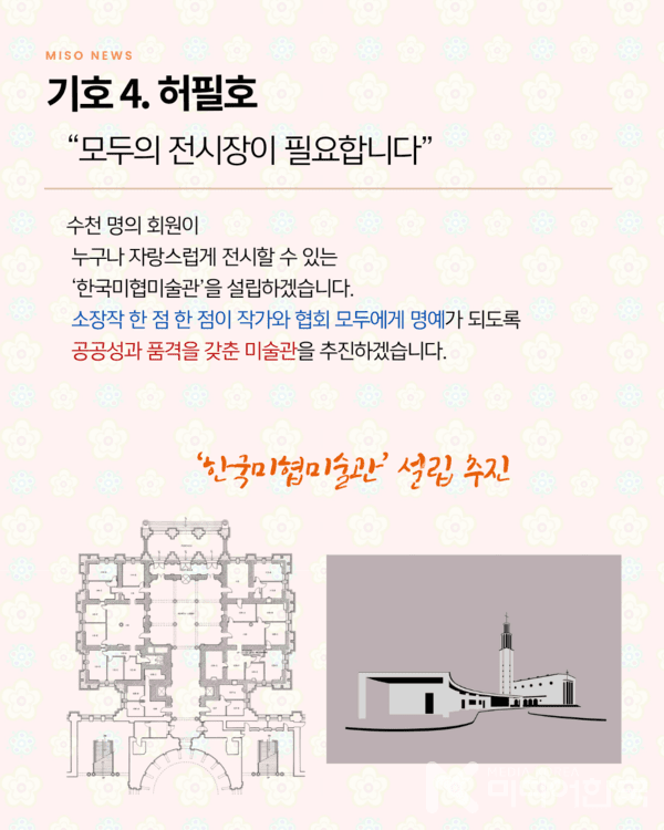 허필호 후보는 오랜 기간 협회 내 다양한 직책을 맡으며 협회의 문제와 현장의 목소리를 가까이서 지켜봤다. 그는 “불공정한 선거와 폐쇄적인 운영, 지역·세대 간의 단절로 회원의 신뢰가 무너졌다”며, “이제 구조를 바로잡고 자존심을 회복해야 할 때”이고 "미협 회원만큼은 다르다는 자부심을 만들고, 나아가 대한민국 미술계 전체의 위상를 높이 끌어올리겠다는 결심을 했다"라고 출마 배경을 설명했다.