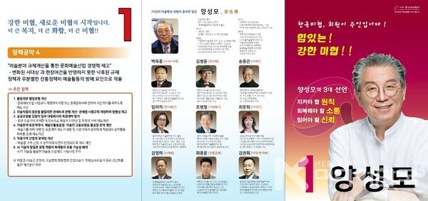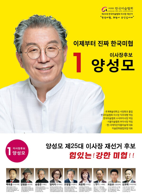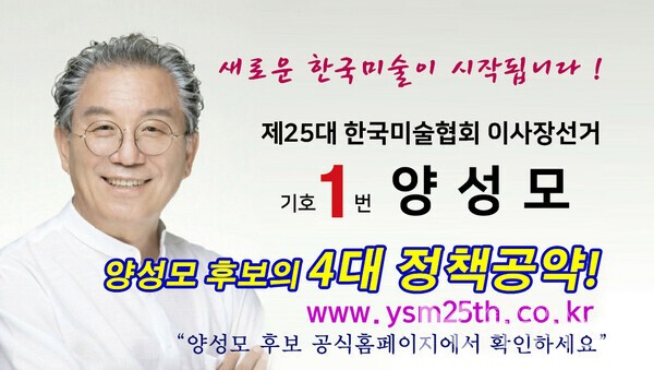 이번 제25대 한국미술협회 이사장 재선거에 출마한 기호 1번 양성모 후보는 위기의 협회를 바로 세우고, 기본과 신뢰, 책임의 원칙 아래 새로운 협회의 미래를 설계하겠다는 강한 의지를 보이고 있다. 회원과 함께 상식과 신뢰가 통하는 협회, 미술인이 주인인 협회를 만들어가겠다는 기호1번 양성모 후보의 행보에 귀추가 주목된다.