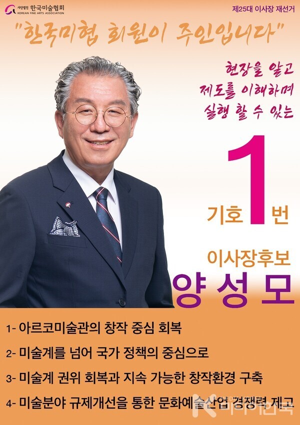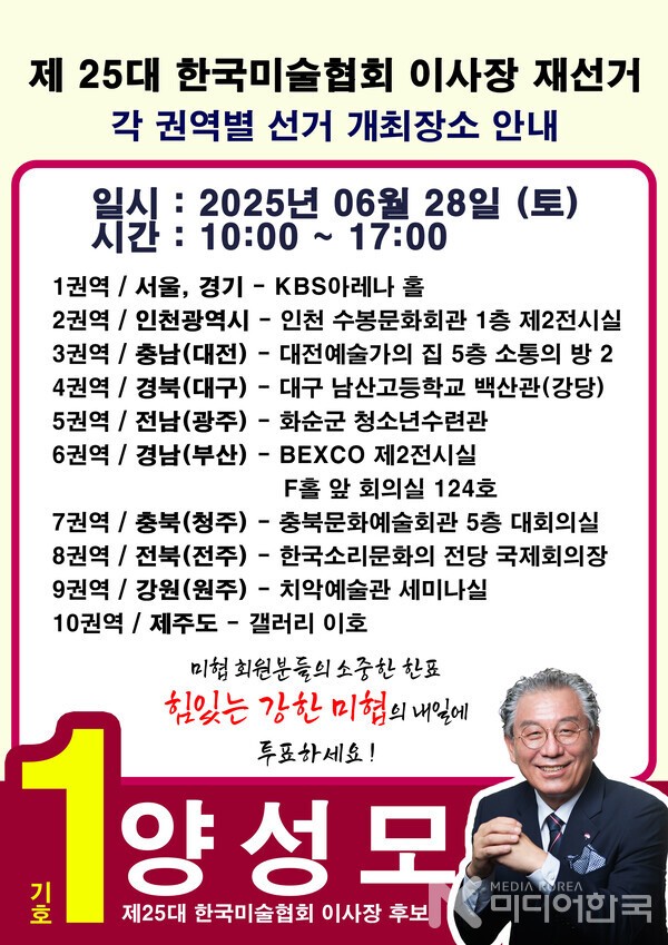 [미디어한국 조승희 기자] 오는 6월28일 (사)한국미술협회 제25대 이사장 재선거를 앞두고 각 후보들이 저마다의 비전과 개혁안을 내세우며 회원들의 선택을 기다리고 있다. 기호 1번 양성모 후보는 "지켜야할 원칙, 회복해야 할 소통, 믿어야 할 신뢰" 3대 선언과 힘있는! 강한 미협!을 슬로건으로 내세우며, 협회의 법적 정통성 회복과 투명한 운영, 회원 권익 증진을 핵심 과제로 제시했다.