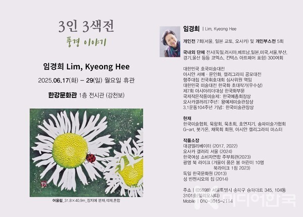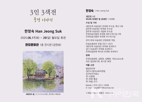 경기도 여주시 한강문화관 1층 전시관(강천보)에서 개최되는 ‘3인 3색展 풍경 이야기’에서는 솔잎 김정숙, 혜천 임경희, 국향 한정숙이 참여해 자연의 다양한 풍경을 화폭에 담아낸다.