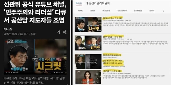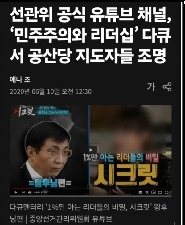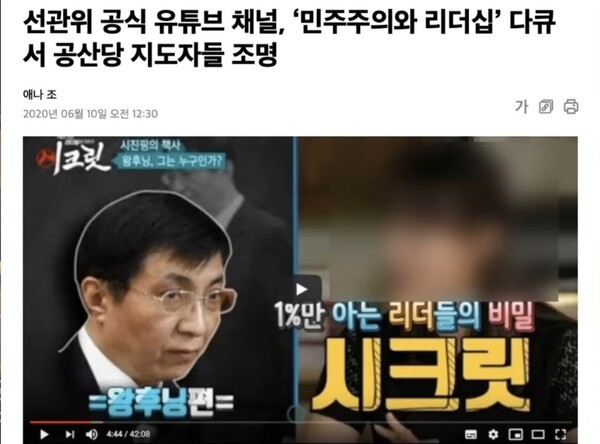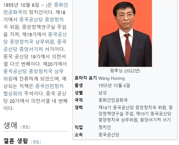 왕후닝은 한국의 중앙선관위의 홈페이에서도 볼 수 있다.