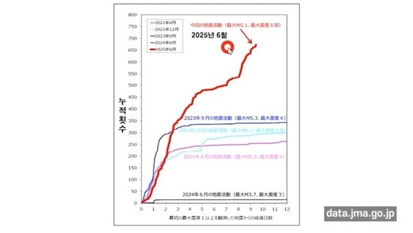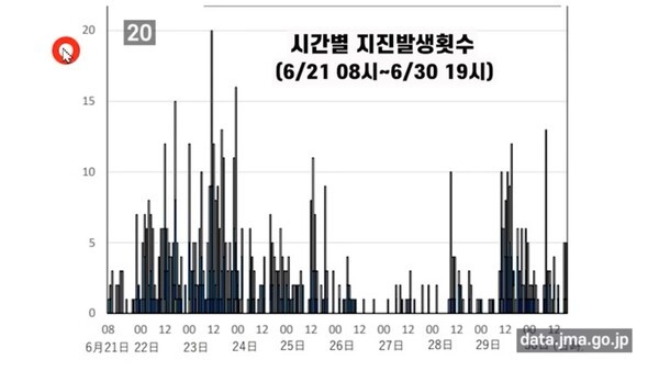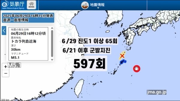 도카라 열도에 지난달 6월 31일부터 647회나 발생하고 있다. 오늘도 지속적으로 군발지진이 발생하고 있다.