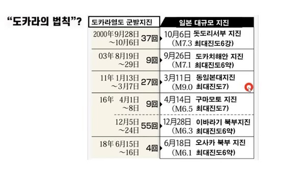 일본 남해안 도카라 열도의 지진은 일단은 잽만 날리고 있는 상황으로 지난달 29일 규모 5.2의 강진발생과 같이 큰 거 한 방이면 잇따라 발생할 후지산 분화와 일본 100여 개의 화산 분화로 상상을 초월하는 재난이 발생한다.