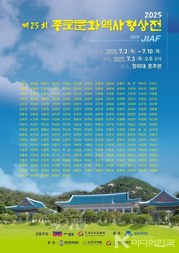 [미디어한국 조승희 기자] 지난 7월 3일 오후 3시, 청와대 춘추관에서 ‘종로문화역사 형상전’이 성대하게 막을 올렸다. 이번 전시는 종로구청과 한국미술협회 종로지회가 공동 주최한 행사로, 종로 지역 예술계의 지속적인 교류와 창작 활동을 기념하는 뜻깊은 자리로 마련되었다.