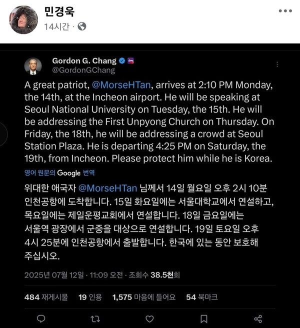 - [사설] 민경욱. 모스탄 전 대사 방한. 제2의 4.19혁명에 6.25전쟁 제2의 인천상륙작전...모스탄 전 대사 방한