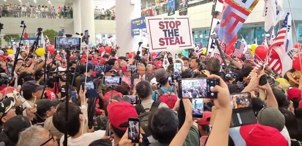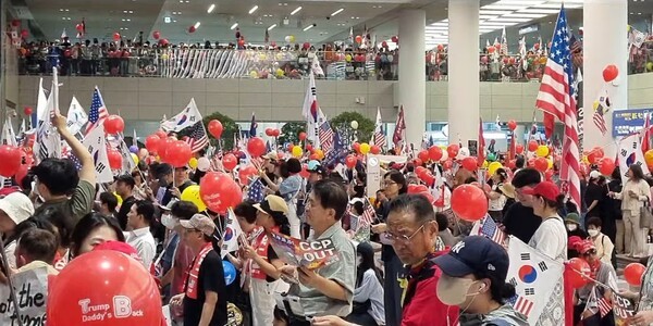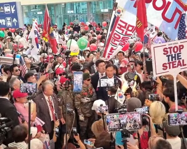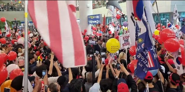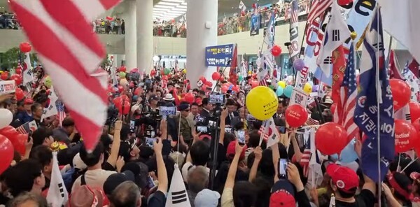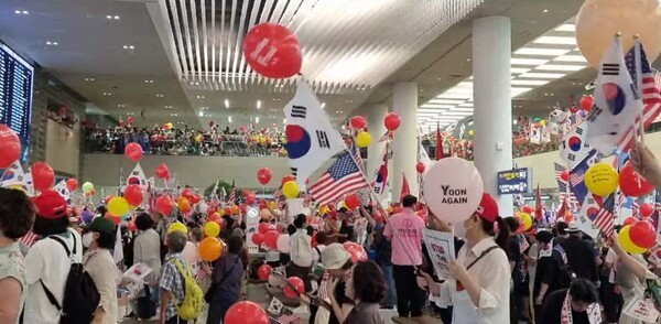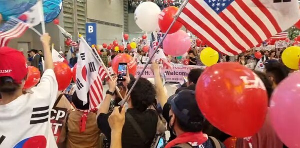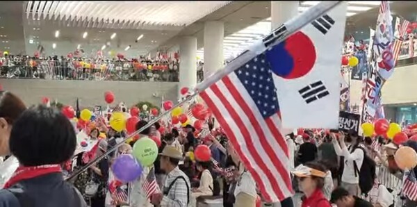 수천 명이 손에 태극기와 성조기를 들고 모인 환영인파는 윤석열 대통령. 윤 어게인. 이재명 구속과 사형을.짱개 북괴. CCP 아웃. USA 등을 연호하며 애국가를 합창하기도 했다.