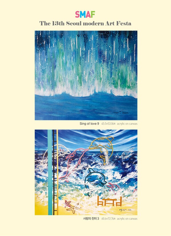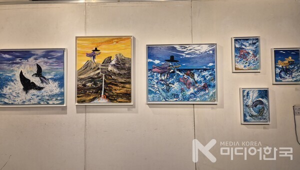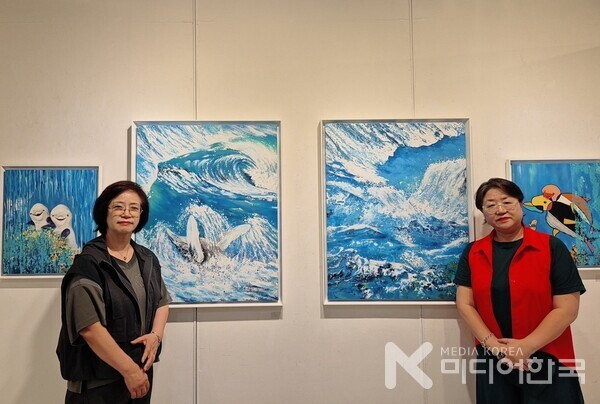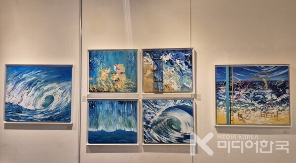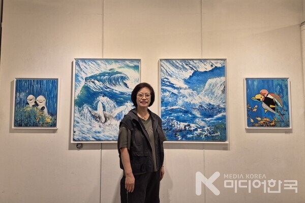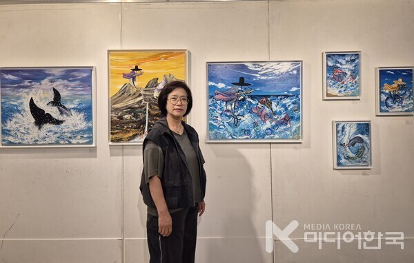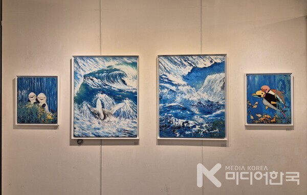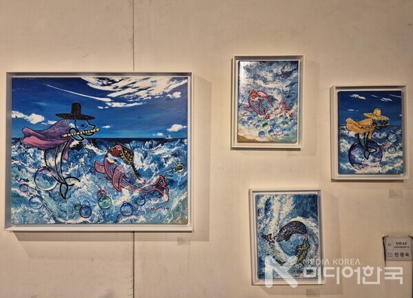 [미디어한국 조승희 기자] 지난 7월 7일까지 인사동 한국미술관 2층 전관에서 열린 열린제13회 서울현대미술페스타에서 만난 서양화가 민경숙의 ‘Sing of Love’ 시리즈는 관람객들의 발걸음을 자연스럽게 멈추게 하는 작품이었다. 작가의 대표 모티프인 돌고래 ‘Arii’는 고요한 푸른 바다를 유영하며, 삶의 고난 속에서도 희망과 사랑, 생명의 울림을 전하는 존재로 화면 속에 부드럽게 표현됐다.