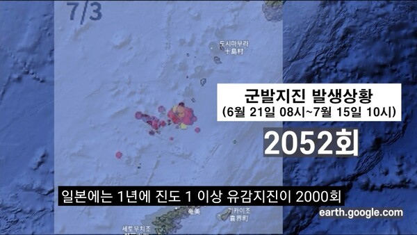난카이 도카라 열도에 지난 달 21일부터 2052회나 군발지진이 발생했다.