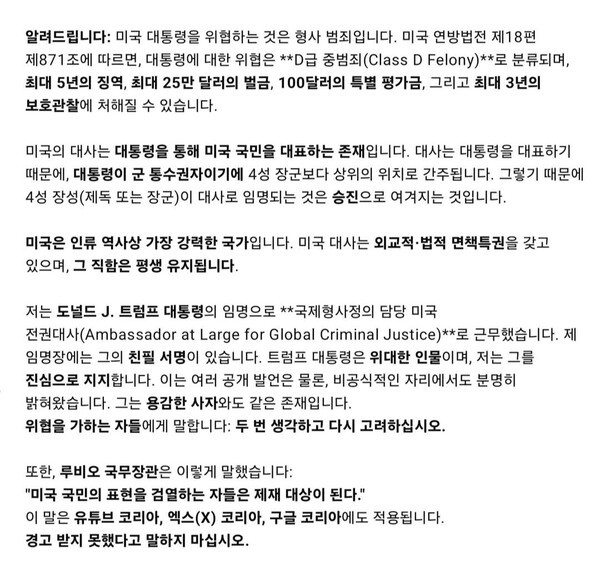 한편, 모스 탄 대사의 신변 보호를 우려하는 반응도 이어지고 있다. 다수 시민들은 “대사님은 하나님이 지켜주실 것”, “진실을 말해준 대사님께 감사한다”며 존경과 지지를 표하고 있다.