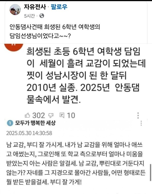 또한 댓글 중에는 “교감이 초등학생 담임 출신으로, 희생된 초등 6학년 여학생 사건과 관련이 있는 인물이었다”는 주장까지 등장하며 사건의 파장은 걷잡을 수 없게 확산되고 있다.