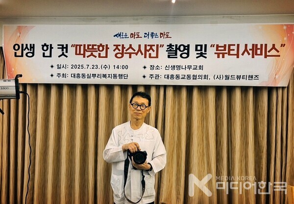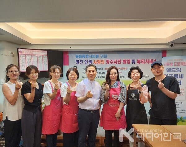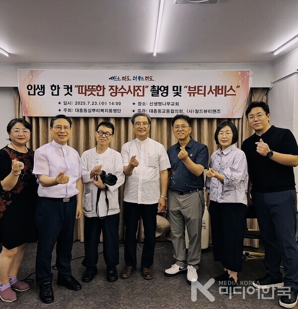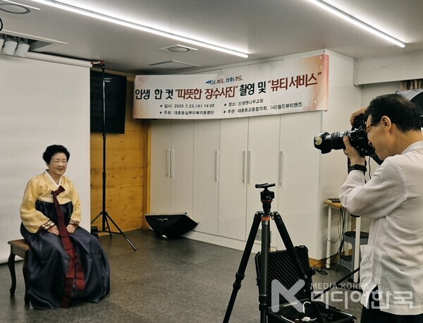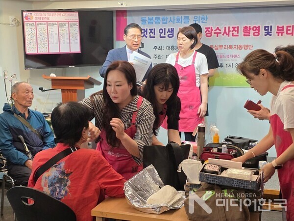 [미디어한국 조승희 기자] 서울 마포구 대흥동주민센터(동장 김순영)와 대흥동실뿌리복지동행단이 주최하고, 대흥동교동협의회(회장 장헌일 목사, 신생명나무교회)와 소외된 이웃을 섬기는 전문인 소셜서비스 NGO인 사단법인 월드뷰티핸즈(회장 최에스더, 신한대학교 K-뷰티학과 교수)가 주관한 ‘돌봄통합사회를 위한 멋진 인생 사랑의 장수사진 촬영 및 뷰티서비스’ 행사가 지난 7월 23일, 신생명나무교회 엘드림노인대학에서 따뜻한 분위기 속에 진행되었다.
