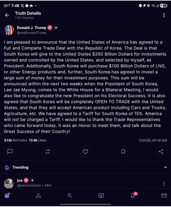 [미디어한국] 민경욱 전 의원이 31일 SNS에 트럼프의 트루스소셜 게시물을 번역하였다