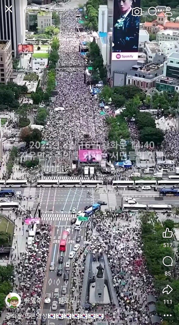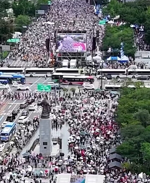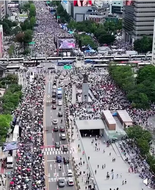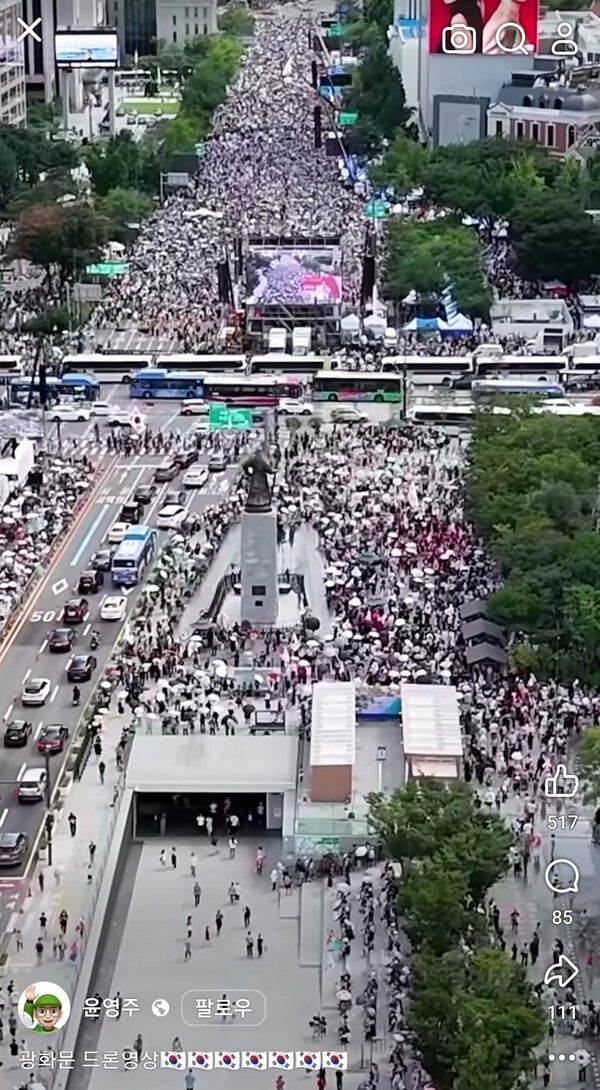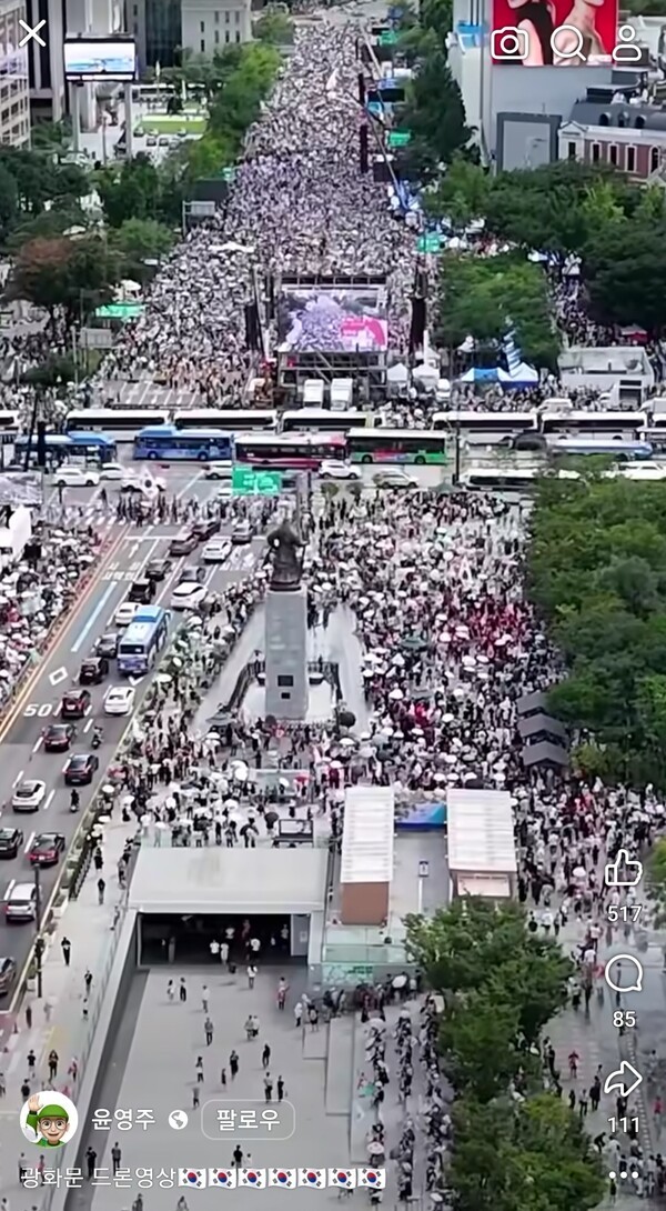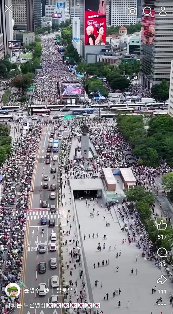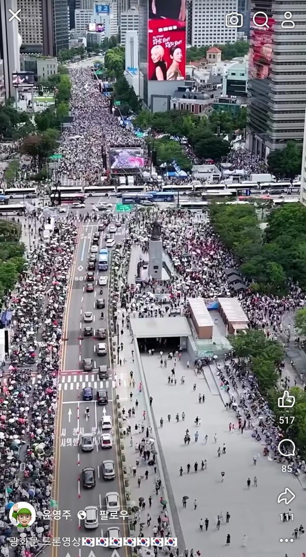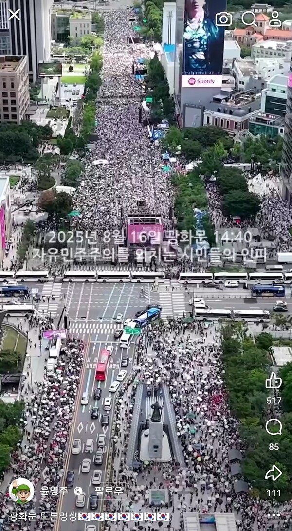 - [정치 포커스] 이 총통. 레드덕?. 광화문 광장 드론 항공 촬영 1300만여 명...해괴한 국민임명식 2~3천여 명