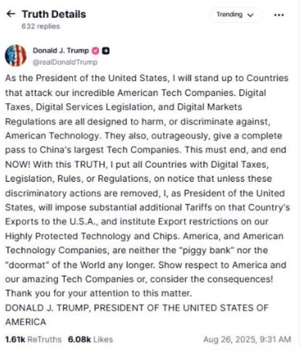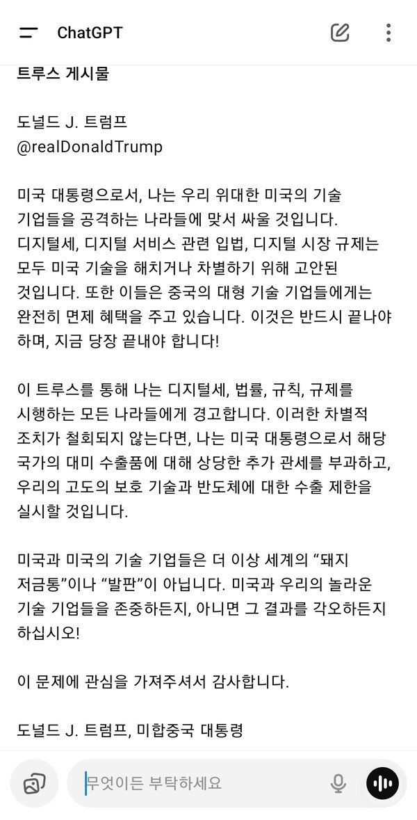 [미디어한국] 한미 환담을 마치고 한국시간 26일 美 도널드 트럼프 대통령의 트루스소셜에 관세에 대한 발표가 있었다.