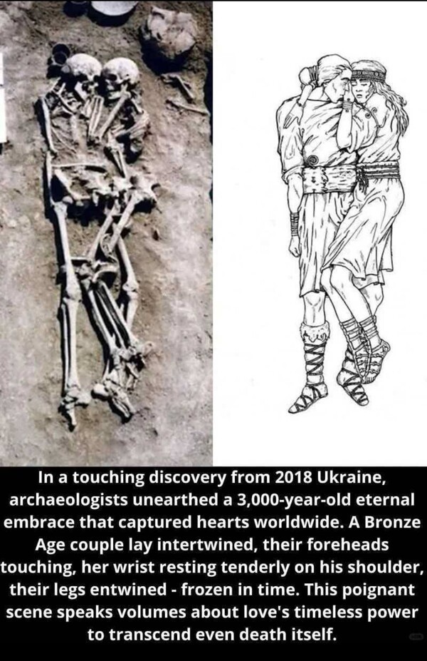 이 특별한 무덤은 이 부부가 청동 시대부터 이어져 온 영원한 사랑을 보여줘요. 이들 부부는 선사 시대 비소츠카야(또는 비소코) 문화에 속하며, 우크라이나 서부 테르노폴 남쪽 페트리키브 마을 근처에서 발견됐어요. "애인 무덤"을 연구하는 미콜라 반드리프스키 교수는 이렇게 말했어요. "이건 정말 특별한 무덤이에요. 남녀가 누워 서로를 꼭 안고 있죠."