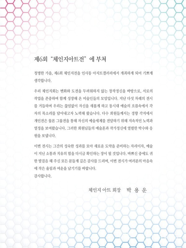 박용운 회장은 “체인지 아트그룹은 변화와 도전을 두려워하지 않는 창작 정신을 바탕으로 서로의 작업을 존중하며 함께 성장해온 예술인들의 모임”이라며, “이번 6회 정기전은 그간의 성숙한 성과를 모아 새로운 도약을 준비하는 자리이자, 예술이 지닌 소통과 치유의 힘을 다시금 확인하는 장이 될 것”이라고 전했다.