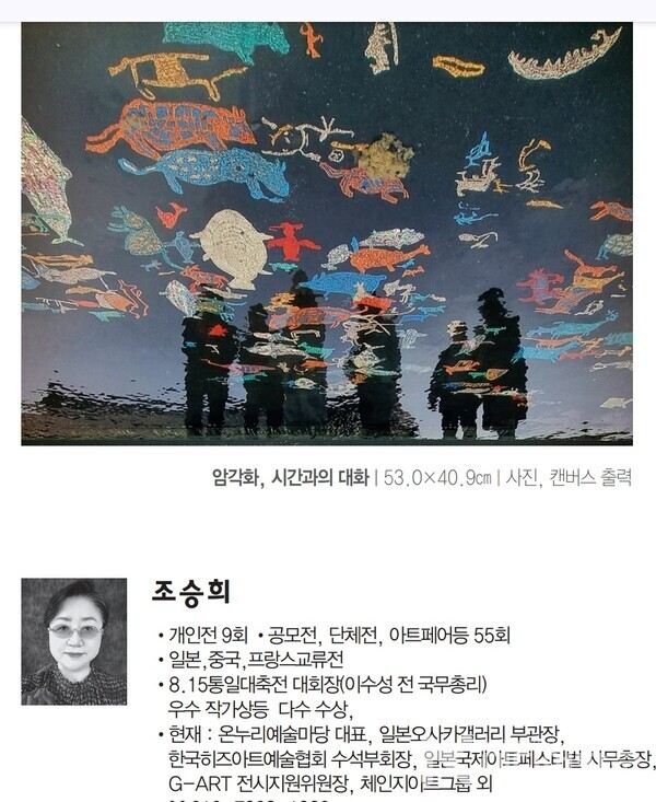 참여 작가인 방주 조승희(芳駐 趙勝姬, Ark Cho Seoung Hee)는 사진 작품 〈암각화, 시간의 대화〉를 선보인다.