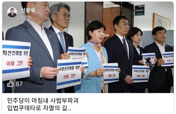 신 의원은 오늘 22일 페이스북에 "민주당이 마침내 사법부파괴 입법쿠데타로 자멸의 길을 선택했습니다.