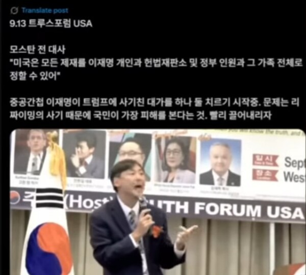 [미디어한국] 지난 13일 미국 트루스포럼에서 모스 탄 전 대사는 미국의 모든 제재를 이재명 개인과 헌법제판소. 정부 인원과 그 가족 전체로 정할수 있다고 말했다.
