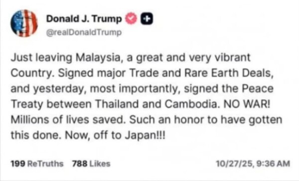 중요한 무역 및 희토류 협정을 체결했고, 어제는 무엇보다도 태국과 캄보디아 간의 평화 조약에 서명했습니다.