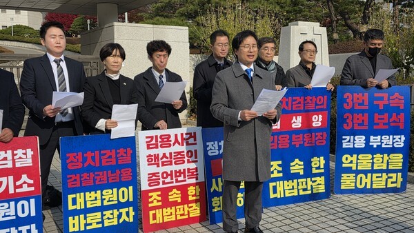 이승훈 전국소상공인정책포럼 대표는 기자회견에서 “세 번 구속되고 세 번 보석된 사례는 유례가 없다”며 “대법원은 더 이상 지체하지 말고, 죄 없는 김용 전 부원장에 대해 무죄 취지의 파기환송을 결정해야 한다”고 밝혔다.