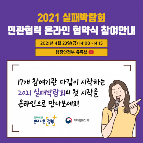 한편 행정안전부는 5월 말, ‘2021 실패박람회’ 선포식을 개최하고, 누구나 언제 어디서든 자유롭게 실패박람회에 참여할 수 있도록 온라인과 오프라인으로 개최되는 다양한 프로그램을 안내할 계획이다.
